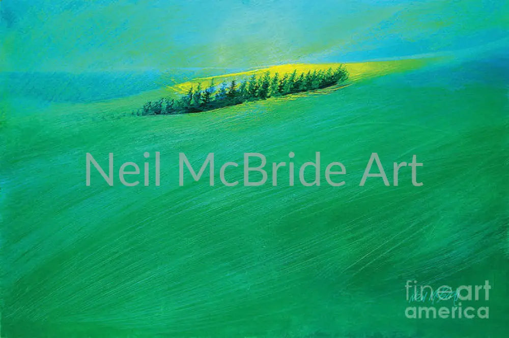 Coastal Copse is a beautifully simple study of a copse of trees set in the rich green landscape of the Yorkshire Wolds.