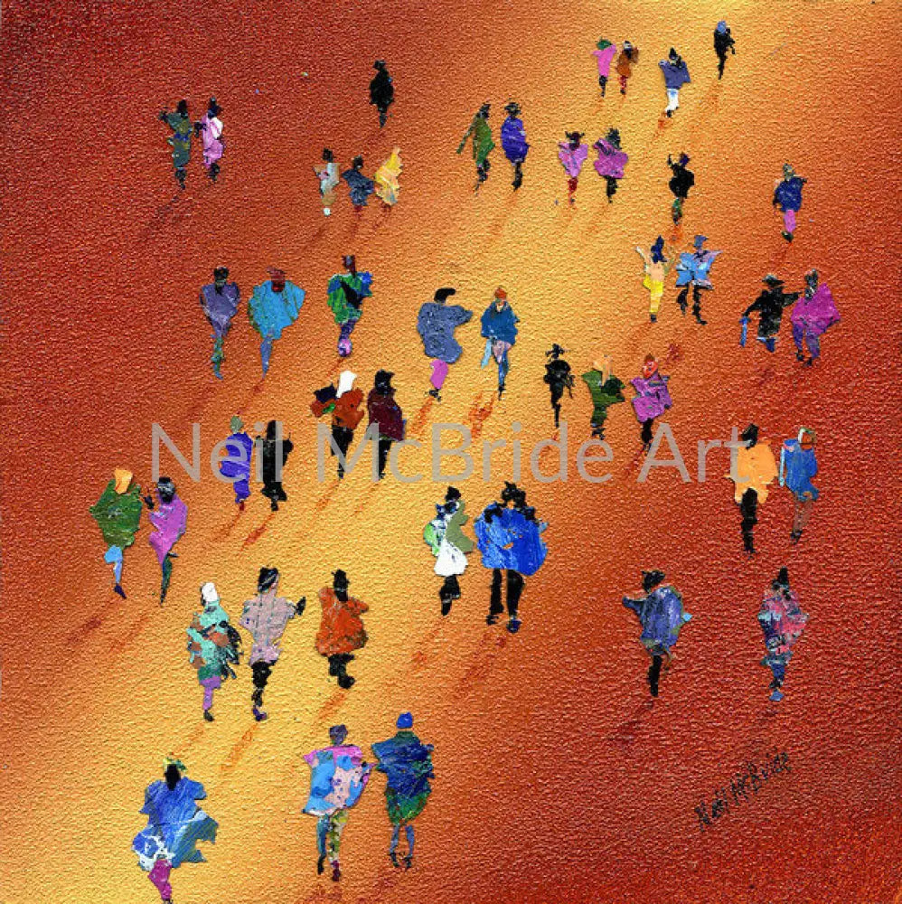 This art print exudes warmth, colour and an unreserved show of love and friendship as this small crowd of people take an evening stroll.