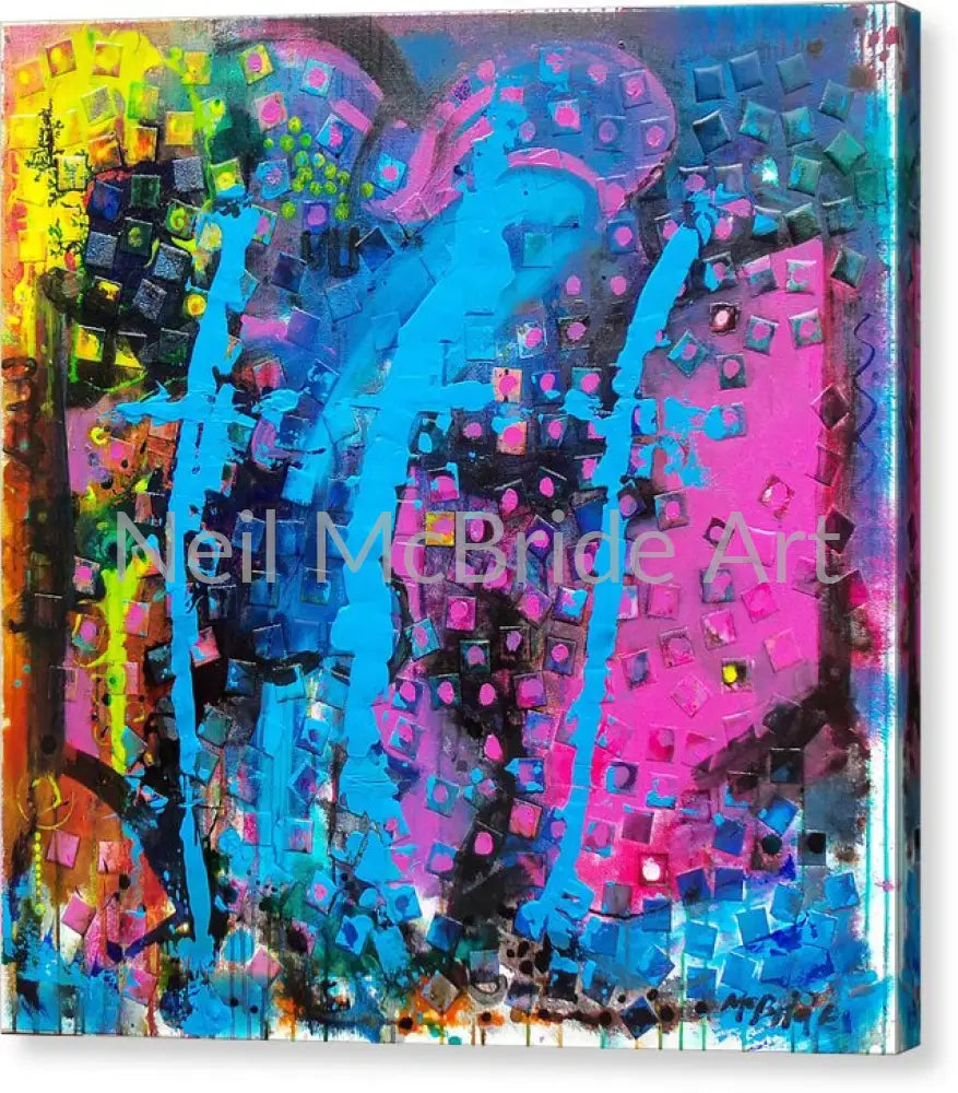 The prints are reproduced from a mixed media painting which was created using the fabric of a previous figurative artwork which was cut into squares and applied to the surface of the new canvas.
