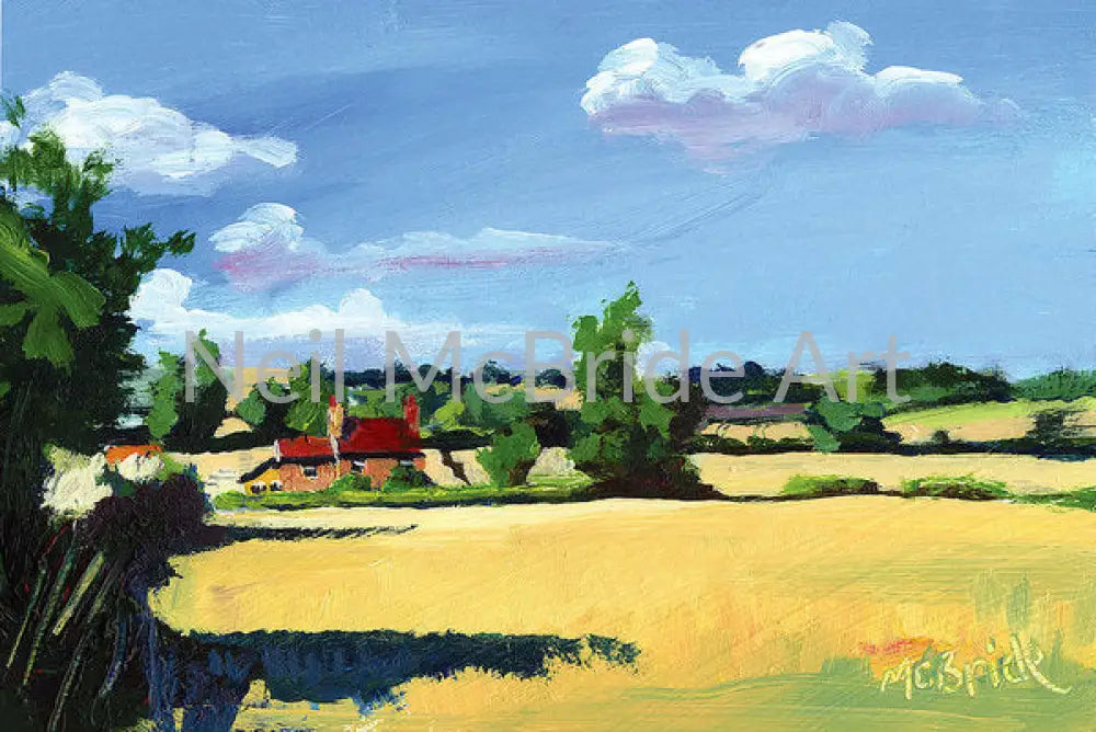 This art print on paper typifies North Yorkshire perfectly. Warm yellow stone and rolling fields of cereal crops below scudding white clouds in a cold blue sky. Yorkshire in all its glory on a perfect summer day.
