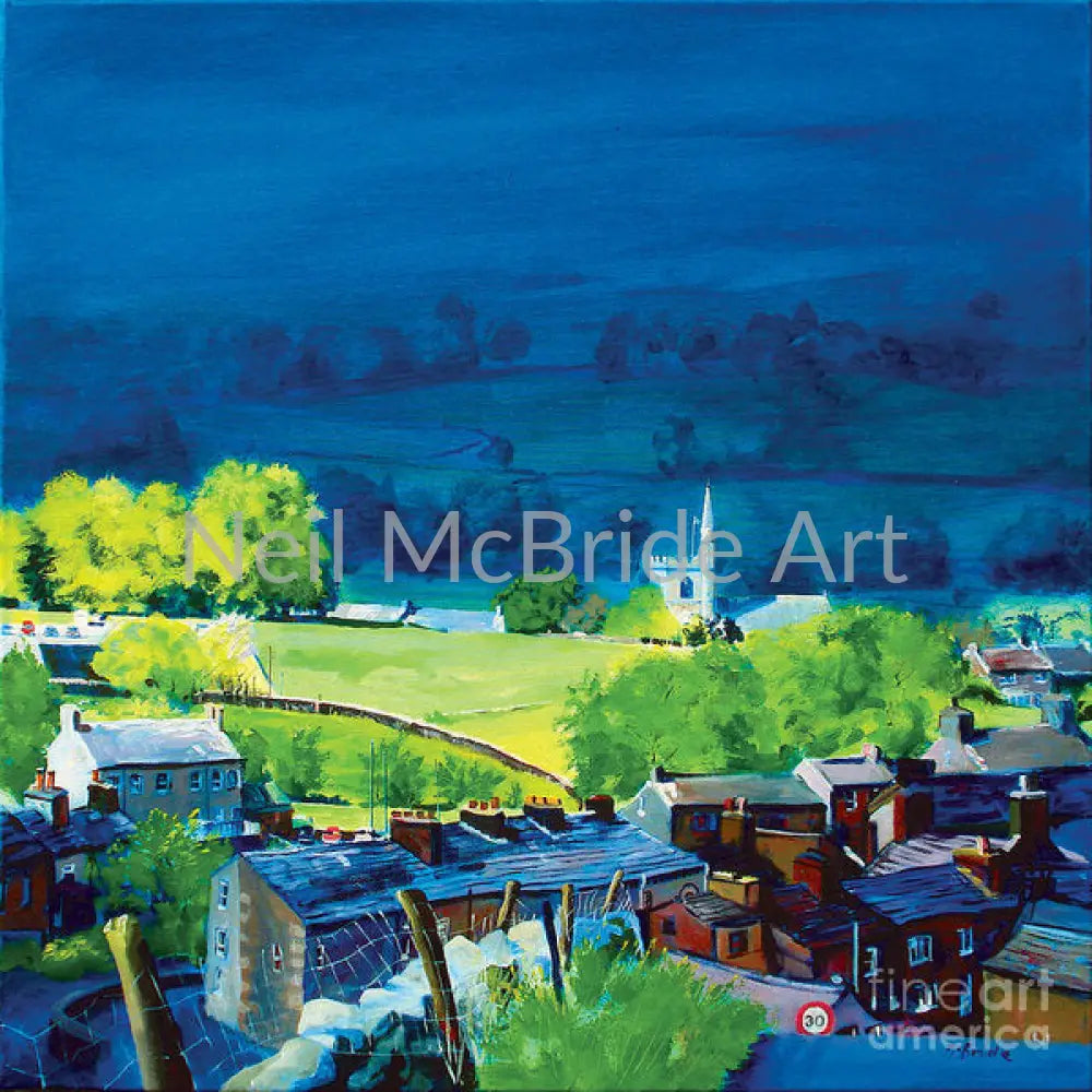 Look closely and you will notice that the distant hills are subdued with shadow in contrast with the middle ground of bright sunlight picking out the fields and church of Hawes village.