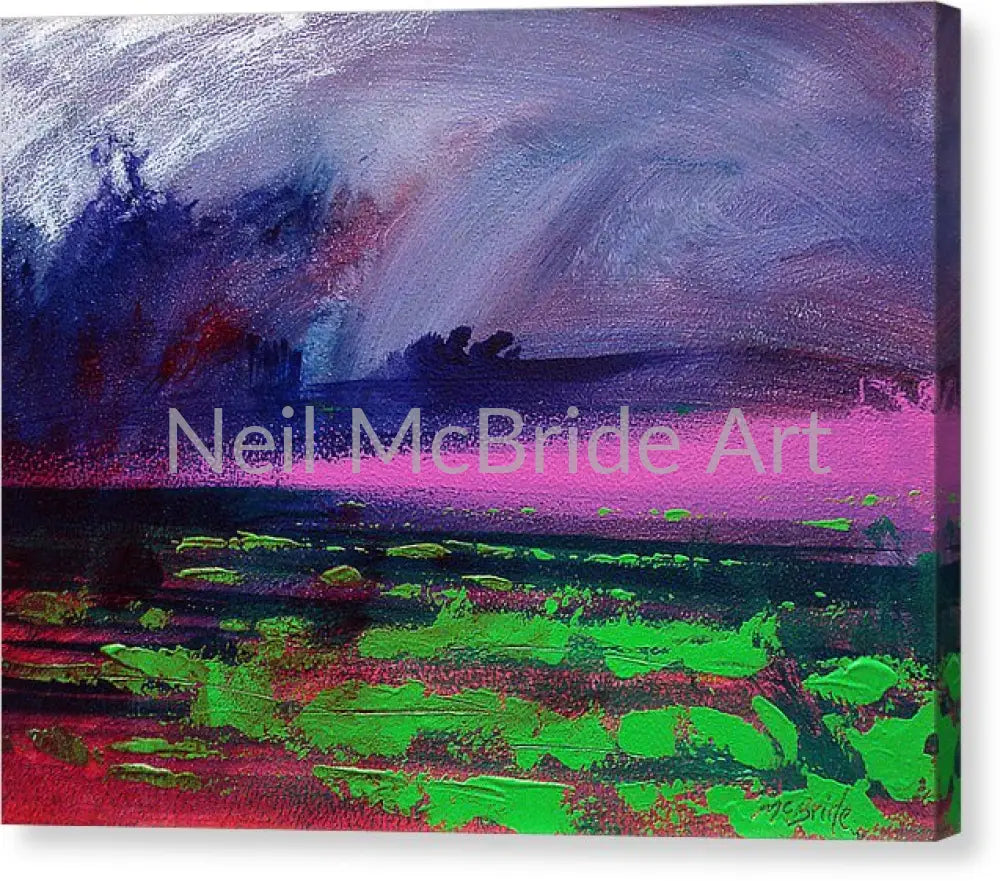 The dramatic, stormy looking sky and dark purple colour is stunningly offset by the shocking pink flash of colour and the contrasting green tufts of grass in this artwork.