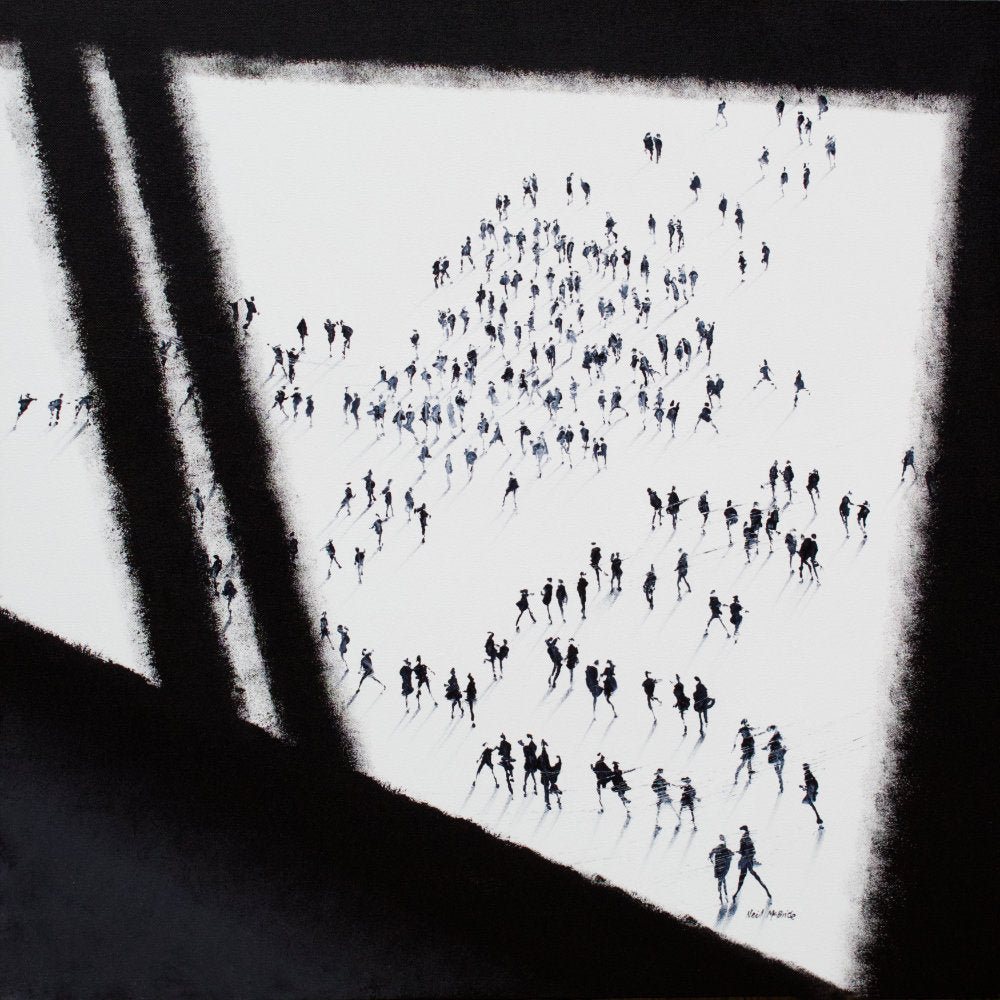 The figurative crowd element is drawn from the firmly established work of figurative crowd painter Neil McBride.