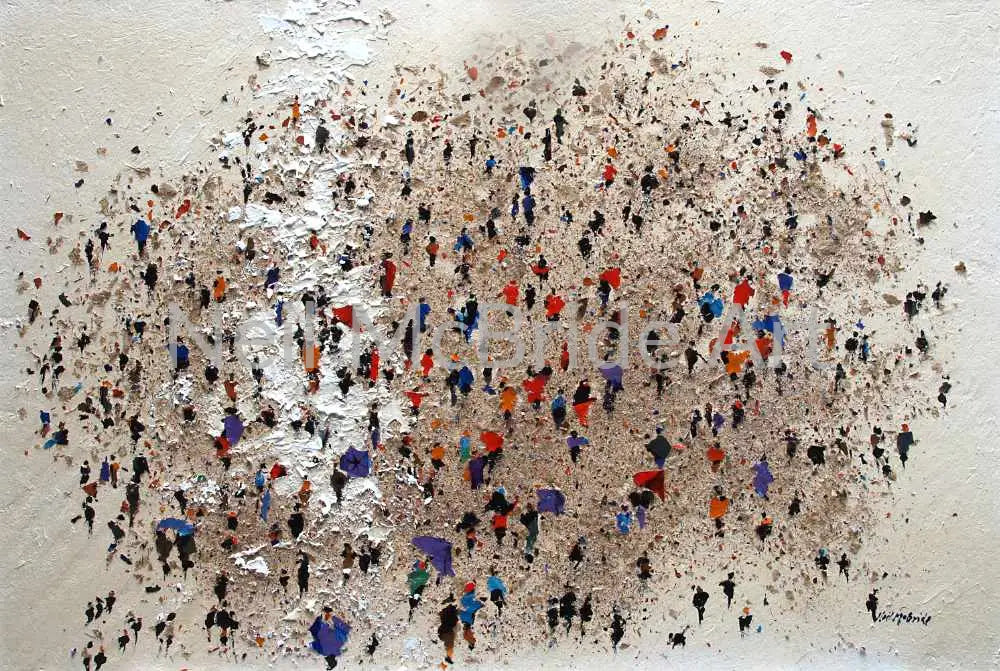 Crowds of music fans wading through the popfest field after  a shower of wet sunshine.