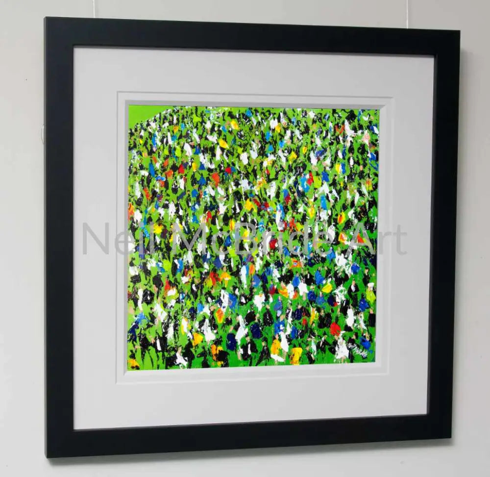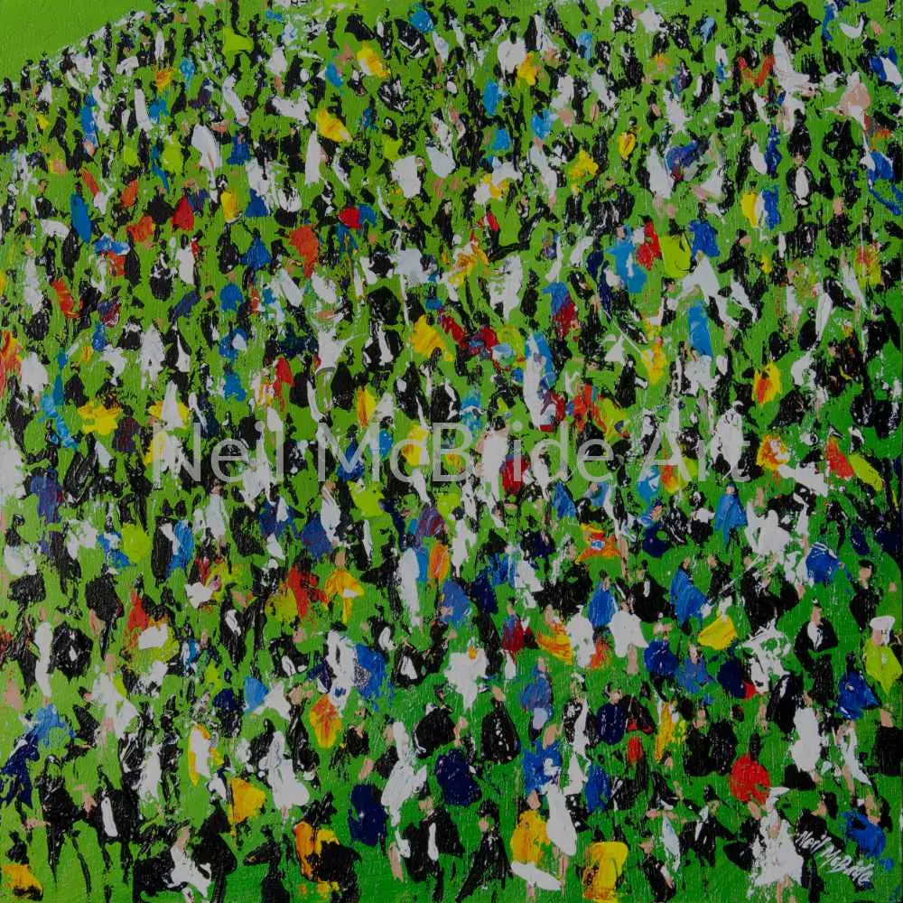 A semi abstract painting of racegoers at a race meeting. The crowd is pressed hard against the track rail in anticipation of a big win. You can almost feel the tension and excitement mounting as the field reach the final furlong.